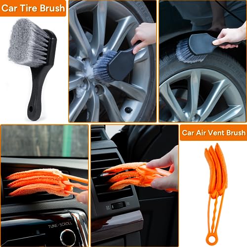 🚕Versatile Cleaning Tools: With a short handle car tire brush, air vent brush, wire brushes, and car wash brush, you can clean tires, air vents, crevices, and hard-to-reach corners effortlessly. Benefit: Achieve professional-level cleaning with specialized tools for different areas of your car.h air after cleaning the air conditioner;Different size detailing brushes help you clean the crevices and corners of your car;Tire brushes are easy to use and won’t scratch your tires.