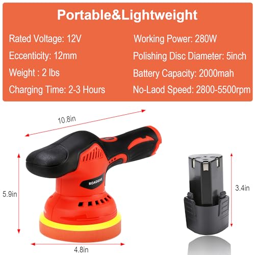 ROADGIVE Cordless Car Buffer Polisher with 2PCS 2.0Ah Battery, (5 Inch/6 Inch) 8 Variable Speed Portable Buffer Polisher Kit, Extra 18PCS Attachments for Car Detailing/Polishing/Waxing