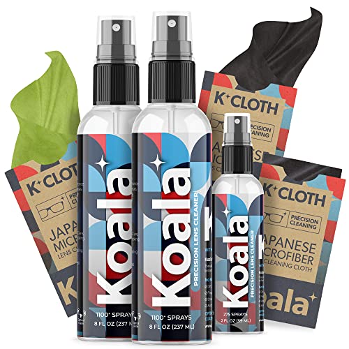 Koala Eyeglass Lens Cleaner Spray Kit | (2x) 8oz + (1x) 2oz Glasses Cleaner Bottle + (3x) Microfiber Cloth | Alcohol Free Eyeglasses, Screen, and Camera Cleaning Kit (6 Piece Set)