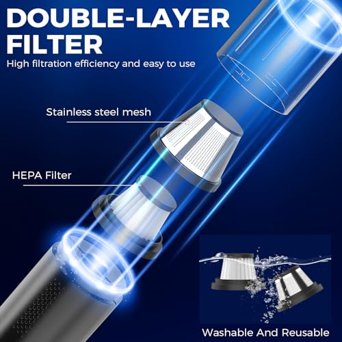 LARGER DUST CUP & DOUBLE-LAYER FILTER: Come with 250 ml dust capacity and upgraded double layer filtration system, this cordless car vacuum which can filter 99.99% of dust and protect the motor from the damage of small particulars, and efficiently handle more dirt , eliminating the need for frequent emptying your cleaning efficiency.