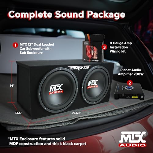 MTX 12-Inch Dual Subwoofer with Amp & Wiring Kit – Complete Car Sound System Bundle with 1200W Loaded Enclosure, Planet Audio Peak 1500W Monoblock Amplifier, and Soundstorm 8 Gauge Installation Set