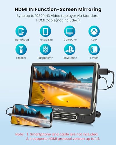📺【HDMI Input & Sync TV/Projector】This DVD player for car can sync up to 1080P video from mobile phones,computers,Raspberry Pi,Xbox or kindle fire etc. (Please confirm whether your mobile phone supports HDMI function before ordering). AV OUT/HDMI OUT allow SYNC playback to your big tv screen or projector to enjoy the good leisure time with your whole family.
