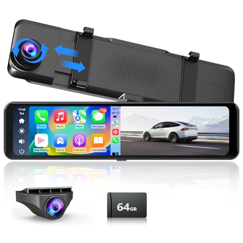 4K Mirror Dash Cam Wireless Carplay & Android Auto, 11″ Rear View Mirror Backup Camera with Voice Control/BT Call/64GB Card Included-G814pro