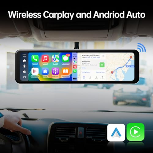 🚗【Wireless Carplay & Easy Connection】The Car Rearview Mirror Camera is equipped with wireless CarPlay and Android Auto through BT connection. It seamlessly integrates with Device Assistant for added functionality. This provides a safer and more convenient method for using your smartphone while driving.