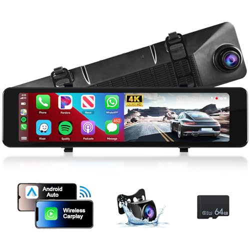 Wireless Carplay 4K Mirror Dash Cam, 11.26″ 1080P Front and Rear View Mirror Camera, Night Vision, Loop Recording, Bluetooth, Touch Screen, Navigation, Android Auto, Voice Control, FM/AUX, 64G Card
