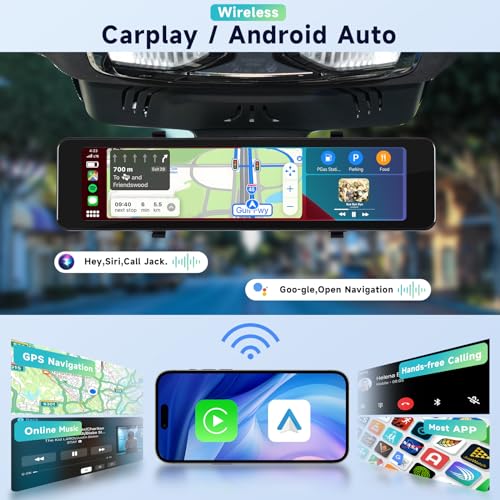 👍Wireless CarPlay And Android Auto: Enable iPhones and Android smartphones to utilize CarPlay and Android Auto wirelessly, providing easy access to map navigation, phone contacts, email, messages, music, and more while driving. Utilize the voice assistant for hands-free control and a safer driving experience.