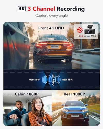 REDTIGER F17 4K 3 Channel Dash Cam, 5GHz WiFi Built-in GPS with 64GB Card, 2160P+1080P+1080P Front and Rear Inside, Triple Car Camera with 3 Inch Screen, IR Night Vision, G Sensor, WDR, Parking Mode