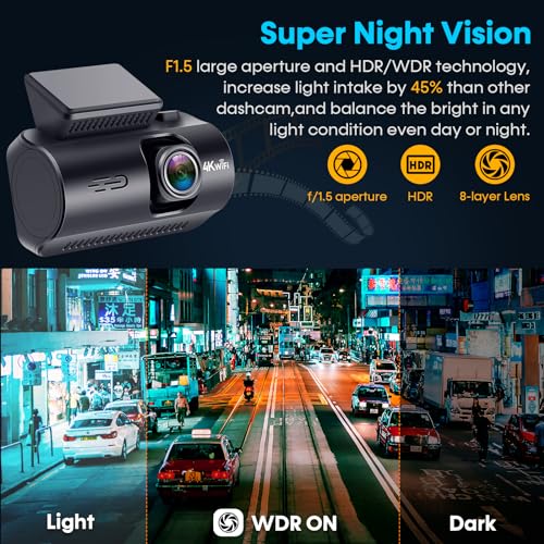 【4K Dual Dash Cam】Using more advanced 22nm chip, Sony image sensor and 8-glass lens, 4K front dash cam and 1080P rear camera are enable to easily capture license plate information of reckless drivers in accidents. It ensures complete and stable record your safe driving behavior. With F1.5 large aperture and HDR/WDR technology, the dash cam front and rear increases light intake by 45% than other dashcams, sending vivid clear image even in strong or weak lighting condition.