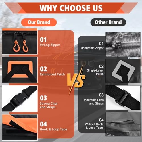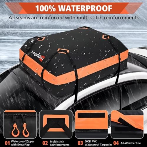100% Waterproof: This rooftop cargo carrier is made of high-density waterproof and wear resistant PVC materials, adopts a sturdy waterproof zippers to reinforce the waterproof seal, which can protect your luggage from rain, dirt and road spray. All seams of the roof bag are reinforced with multi-stitch reinforcements to increase durability and reduce risk of ripping by the wind.