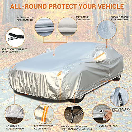 Tecoom Car Cover Waterproof All Weather, 3 Layers Outdoor Car Covers for Automobiles with Zipper Door/Lock, Fleece Lining Full Exterior Covers Wind Snow UV Sun Protection Fit for Sedan (170-190 Inch)