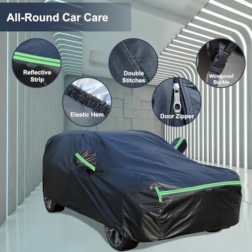 Premium Quality Material – SUV Car cover is made from high-density coated Oxford fabric material, featuring a multi-layer structured design for enhanced durability and protection. The outer layer of the SUV car cover keeps your vehicle from rain, snow, sun, pollen, tree sap and other outdoor extreme weather conditions. The inner fleece layer of the car cover waterproof all weather is gentle and breathable, keeping your car’s finish looking new.