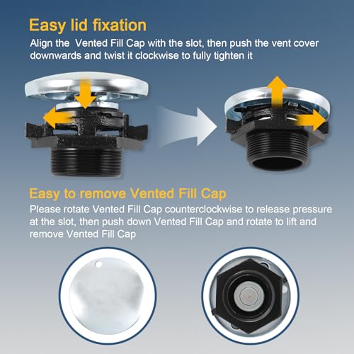 [EASY TO INSTALL] Align the vented gas cap with the notch, push down and clockwise twisting to tighten the diesel tank cap all the way. To remove transfer tank cap, counter-clockwise twist slowly to the notch to vent pressure. Push down and twist to lift pressure vent cap and remove.