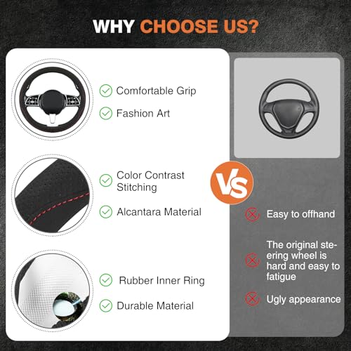 5.【Durable Long-lasting】:Despite daily use and exposure to various weather conditions, the Alcantara Steering Wheel Cover maintains its quality and appearance over time. It not only improves the appearance of your vehicle but also provides added comfort and reduces fatigue during long drives. Protect your steering wheel and enhance its beauty.