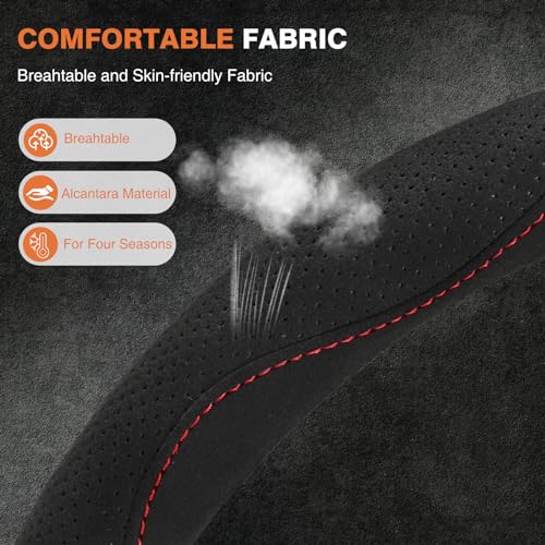 2.【All-season application】:Thin suede steering wheel cover made of sweat absorbing, breathable alcantara material,The inner ring is made of rubber material, anti-slip ,The steering wheel cover has good heat and cold resistance can be used all year round.
