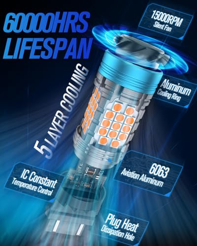 【5-Layer Cooling System】This 3156 rear turn signal bulb built-in stable current IC driver avoids digital or VHF radio signal interference. This 3057 led bulb has the 2024 latest cooling system:Intelligent thermostatic IC + 15,000RPM silent fan + aluminum cooling ring + 6063 aviation aluminum lamp body + plug heat dissipation hole, ensuring lifespan up to 60,000 hours.