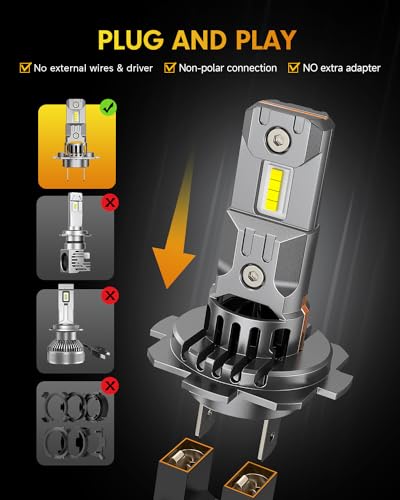 【3 Minutes Easy Installation】 All-in-one design and mini size H7 light bulbs. Our bulbs feature built-in driver technology, no bulky bulb base, no extra driver, no additional adapters/retainers required, true 1:1 halogen size, so there is no need to worry about space constraints for bulb housing installation. It can be installed within 3 mins by simply plugging and playing.