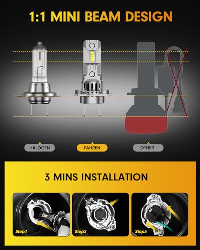 【Perfect Beam Pattern】Fahren H7 light bulbs feature advanced same beam pattern, its 0.03in ultra-thin profile makes the chips much closer for a Super-Focused beam, delivering wider angles and farther range light on the road. No need to adjust the beam pattern, without any dark spots and no glare to the oncoming traffic ensures a safer driving experience for you and others.