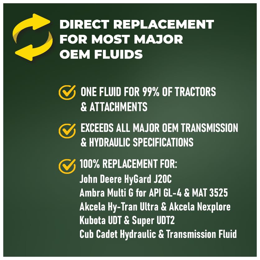 Outstanding performance versus OEM fluids and specifications; wide ranging, total compatibility with all John Deere, Kubota, Case, Class, Massey Ferguson, and most other farming / tractors / harvester equipment