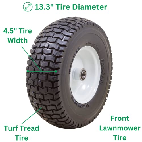 Turf tread tire on a 3″-Inch centered rim with 3/4″-Inch commercial grade oil infused bushings. The perfect tire for your riding lawnmower. Marathon Flat Free lawnmower tires provide the bounce and load handling characteristics similar to an air-filled tire with the benefit of never going flat. Please contact Marathon for additional axle sizes.