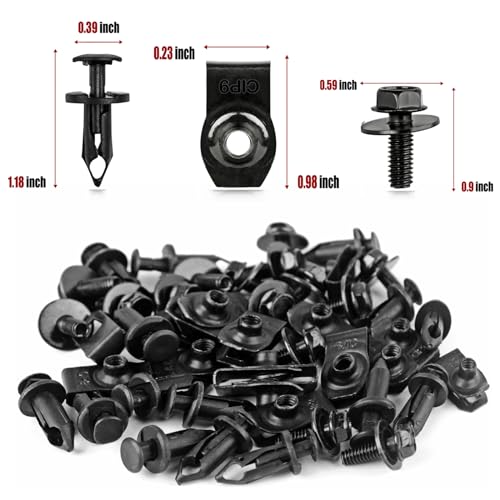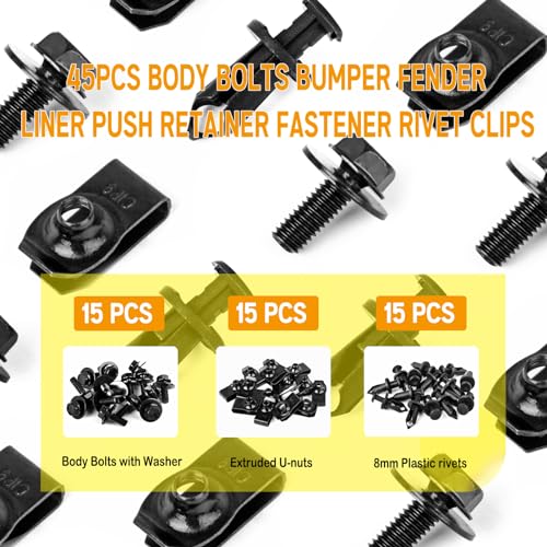 Package includes: 15 X Extruded U-nuts – Replace/Fix to the Bumper, 15 X Body Bolts with Built-in Fender Washer, 15 X Plastic Push Clips, 3 in 1 enclosed pack