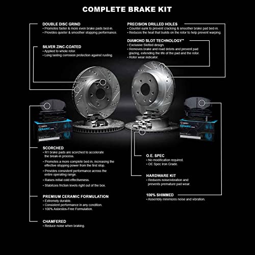 All-in-One Complete Brake Kit Replacement: R1 Concepts eLine Series Front & Rear Brake Kit comes with (4) high performance brake rotors (8) performance brake pads and hardware