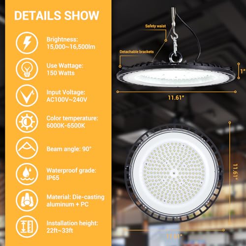 DADUL 4 Pack UFO LED High Bay Light, 150W 16,500LM LED High Bay Light, 6500K Daylight LED Shop Lights with US Plug, IP65 Waterproof Commercial Bay Lighting for Workshop, Garage, Warehouse