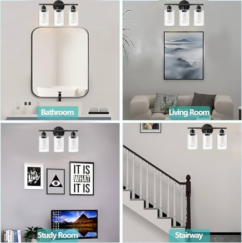 ✔【High Thickness Clear Glass Lampshade】 The bathroom vanity light fixture is made of high-quality thick glass lampshades, which are not easy to break. Baking varnish metal lamp body, durable, anti-oxidation, rust-proof. And the combination of a matte black finish metal frame and transparent glass shade offers simplicity with a contemporary flair.which can bring a more refined and warm feeling for your home lighting.