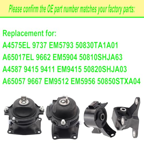 COMPATIBLE FOR:This engine motor mount set compatible for 2011 2012 2013 2014 2015 2016 Odyssey Touring Elite 3.5L
