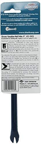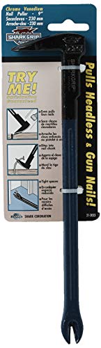 Pneumatic nails often have weak heads, but SharkGrip nail pullers pull from the shank. The tool’s hardened “V” takes a positive bite into the nail’s shank for easy removal. The puller’s curved underside easily slides under an embedded nailhead or onto the nail’s shank. The back of the puller doubles as a striking head for your hammer. SharkGrip Nail pullers removes even embedded, headless, or rusted nails. An advanced tempering method in the drop forged construction process of this nail puller gives it extra durability to prevent chipping or bending. 9 in. for Finish Nail (1-1/4 in. to 2-1/4 in.) and Staples.