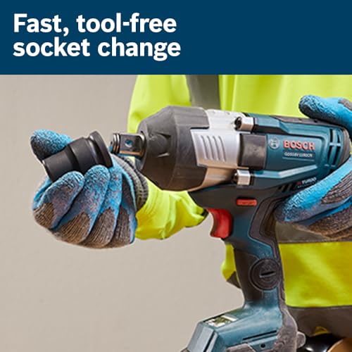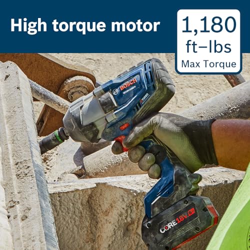 The Bosch PROFACTOR™ GDS18V-1180C Connected-Ready 3/4 In. Impact Wrench with Friction Ring and Thru-Hole is designed to quickly release and fasten large bolts, nuts, and anchors in heavy equipment applications. A bolt-busting powerhouse, the wrench delivers up to 1,620 Ft.-Lbs. of breakaway torque for increased performance and 1,180 Ft.-Lbs. of controlled max fastening torque. This cordless wrench is equipped with three speed/torque settings (0-800 / 1,300 / 1,750 rpm) for more precise user control, even when tackling demanding tasks. Preset modes, auto slow down, and auto shut off offer greater versatility Auto Bolt Release stops rotation when there is no load on the tool to help prevent accidentally dropping bolts and nuts during removal. The friction ring allows for quick socket changes while the thru-hole provides secure socket retention. The included removable rubber boot helps to protect the tool and work surface and the LED light illuminates dimly lit work areas.