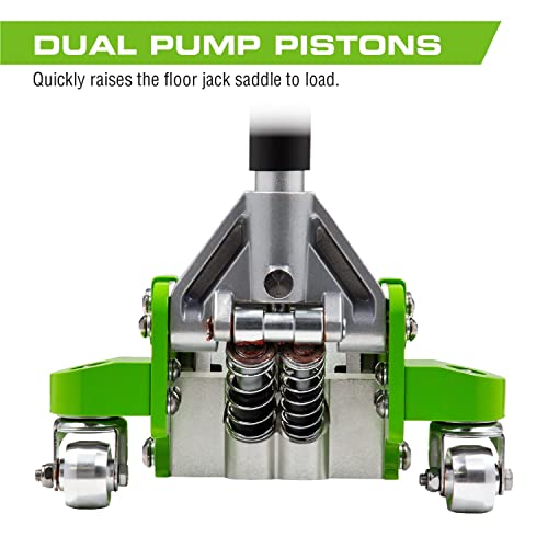 DUAL PUMP PISTONS: Quickly Raises The Floor Jack Saddle To Load