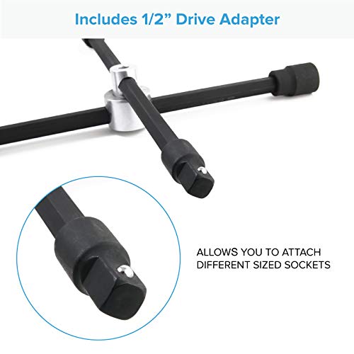 Comes with most popular socket sizes: 17mm, 19mm, and 21mm sockets (can also be used for SAE 11/16″, 3/4″, 13/16″ diameter lug nuts). Includes a 1/2″ drive adapter to allow you to use a different sized socket.
