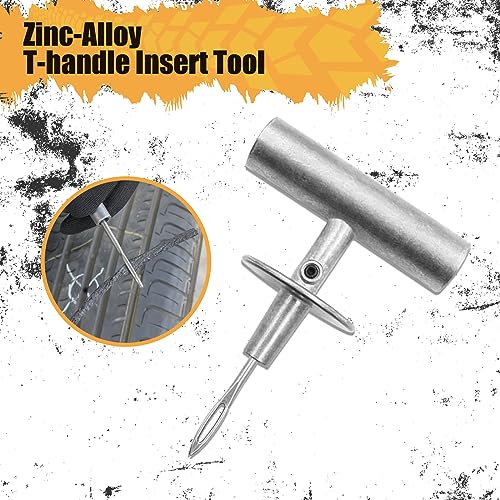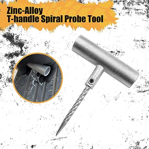 Tire Repair Kits Contains 1pc T-handle Insert Tool, 1pc handle Rasp Tool, 20pcs 4″ repair plugs, 4pcs plastic caps, 4pcs valve core, 1pc 4-way tool, 1pc knife, 1pc manual, 1pc box.